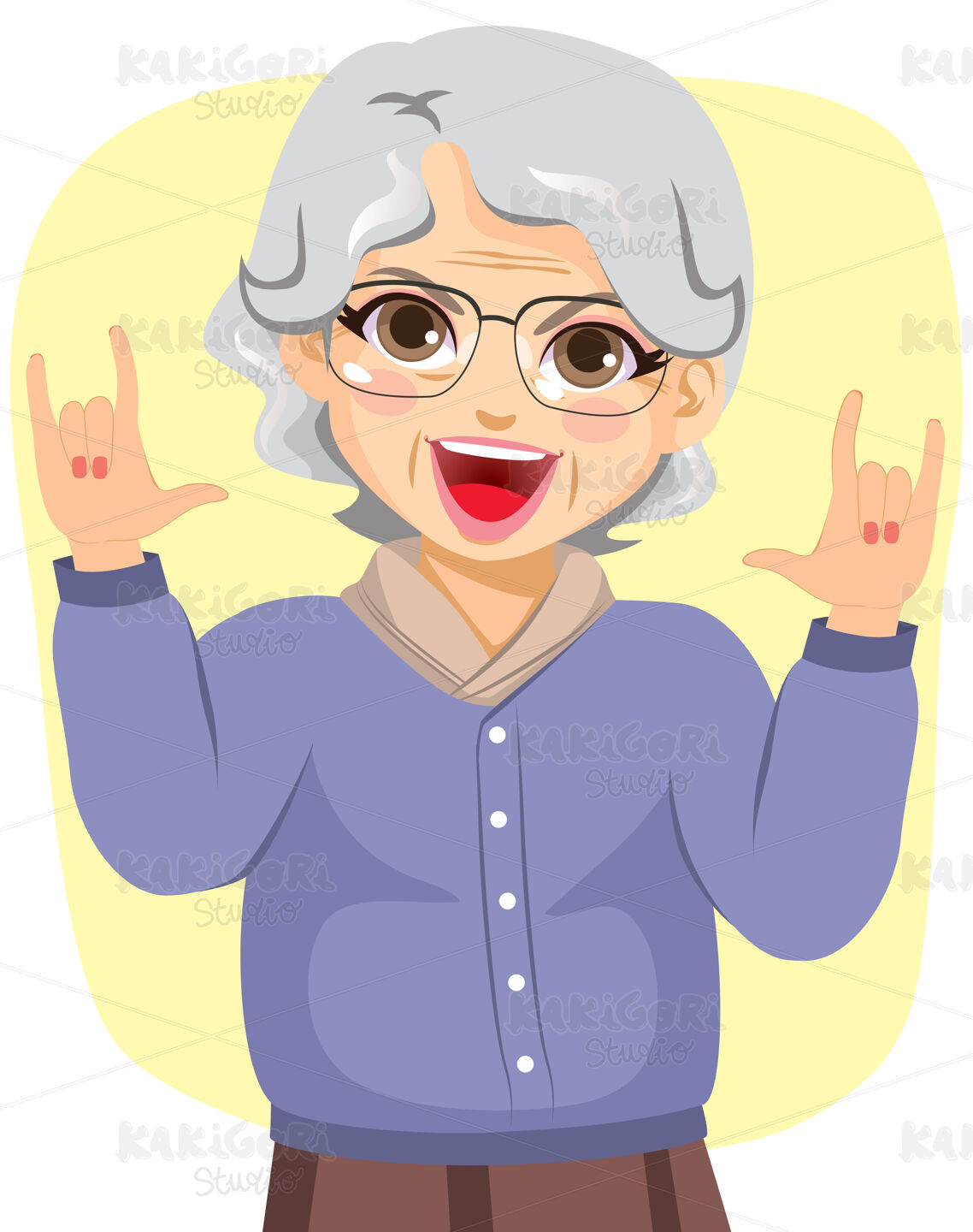 Illustration of funny grandmother rocking with horn hands up
