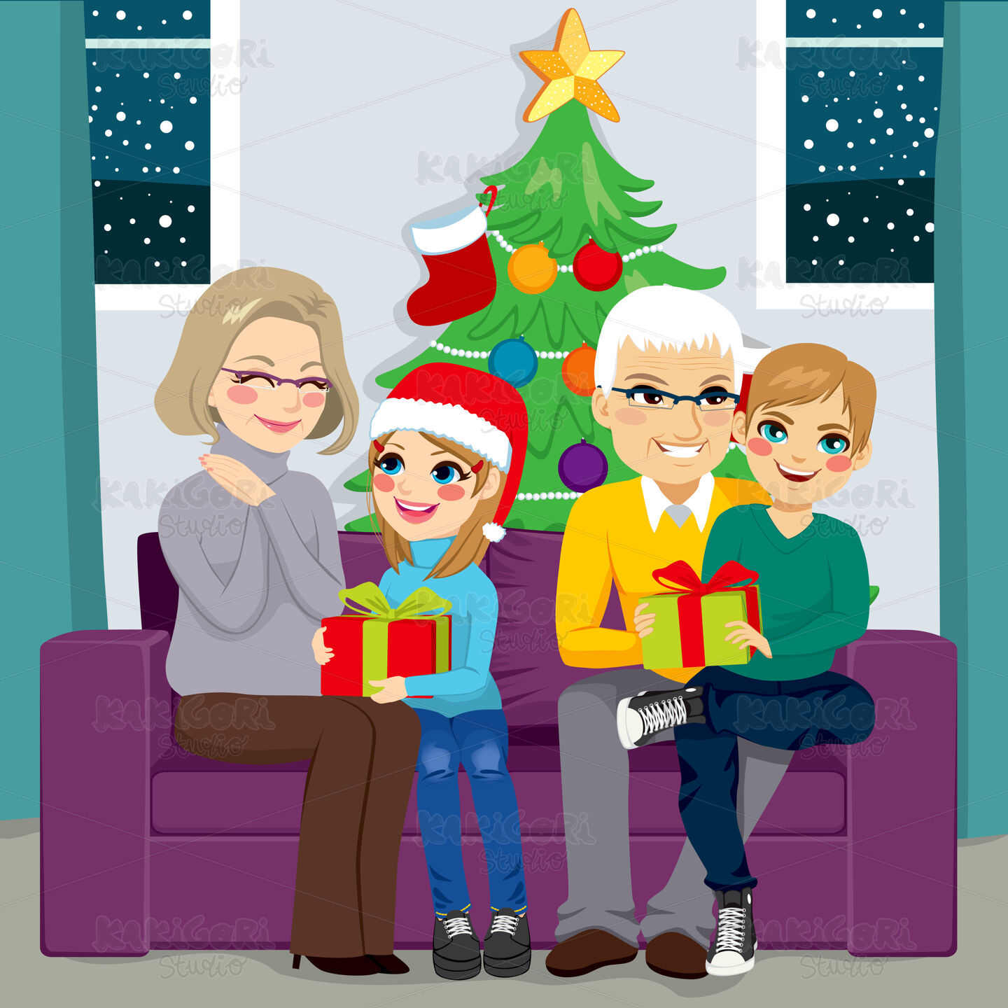 Grandparents with granddaughter and grandson sharing gifts in Christmas day sitting on sofa at home with tree on background