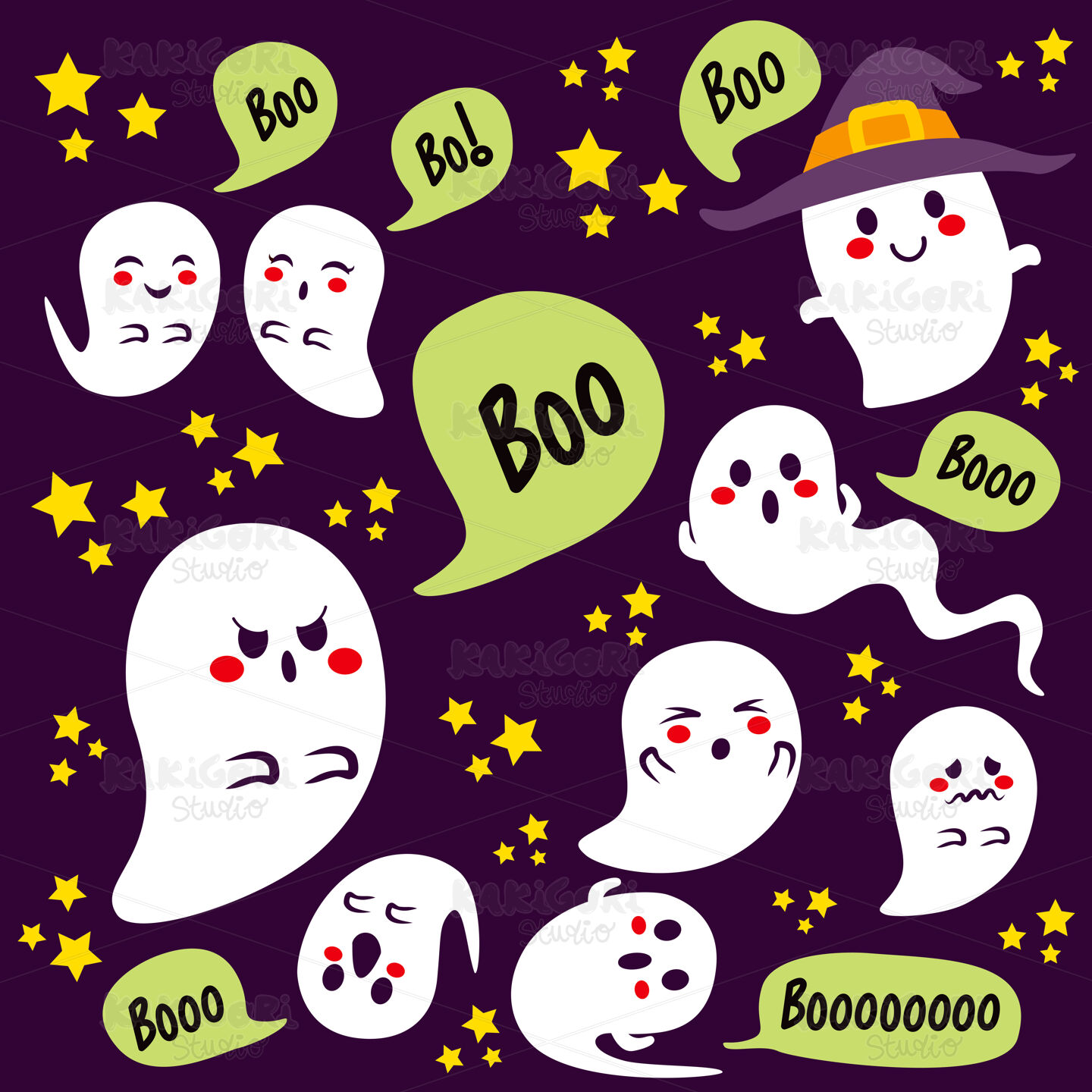 Cute Halloween different ghosts characters with boo text on bubble speech and stars