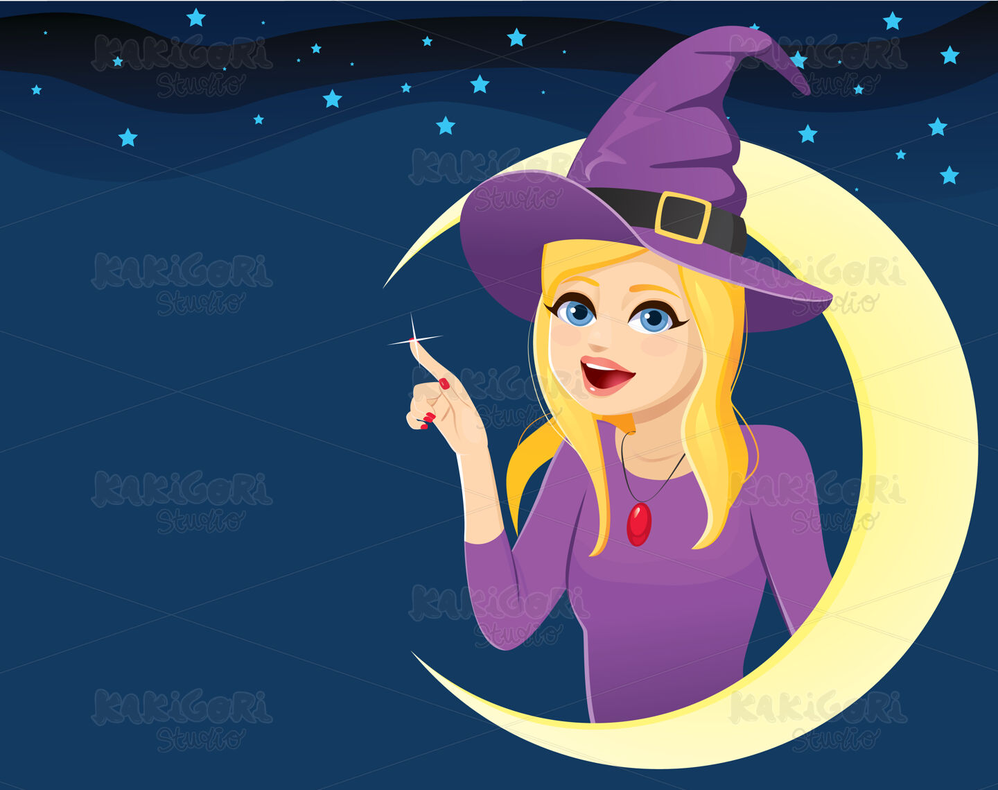 / Halloween Moon Witch Stars Background Clipart Vector Illustration 04914