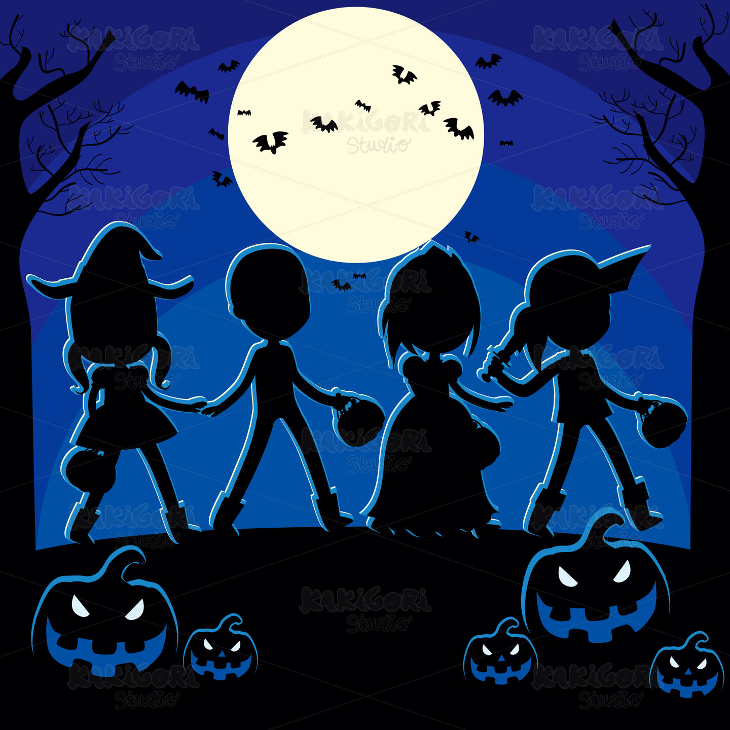 Children trick or treat and pumpkin silhouette on dark blue full moon night background
