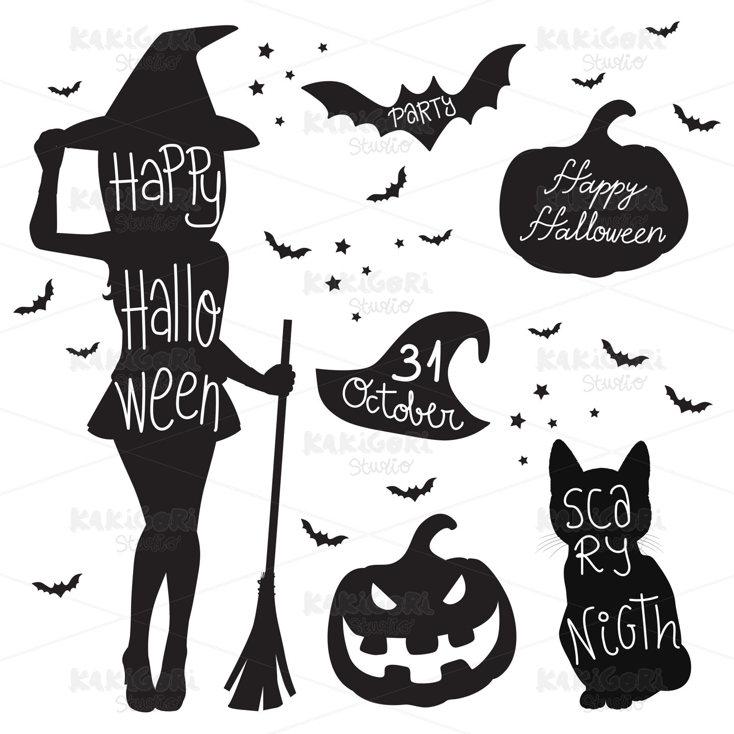 Black and white illustration of Halloween symbol elements silhouette with text