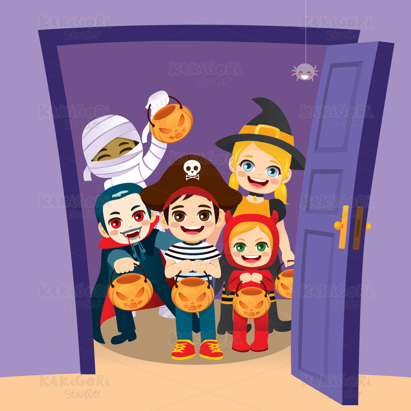 Group of kids standing on the door holding pumpkin bags playing Trick or Treat on Halloween