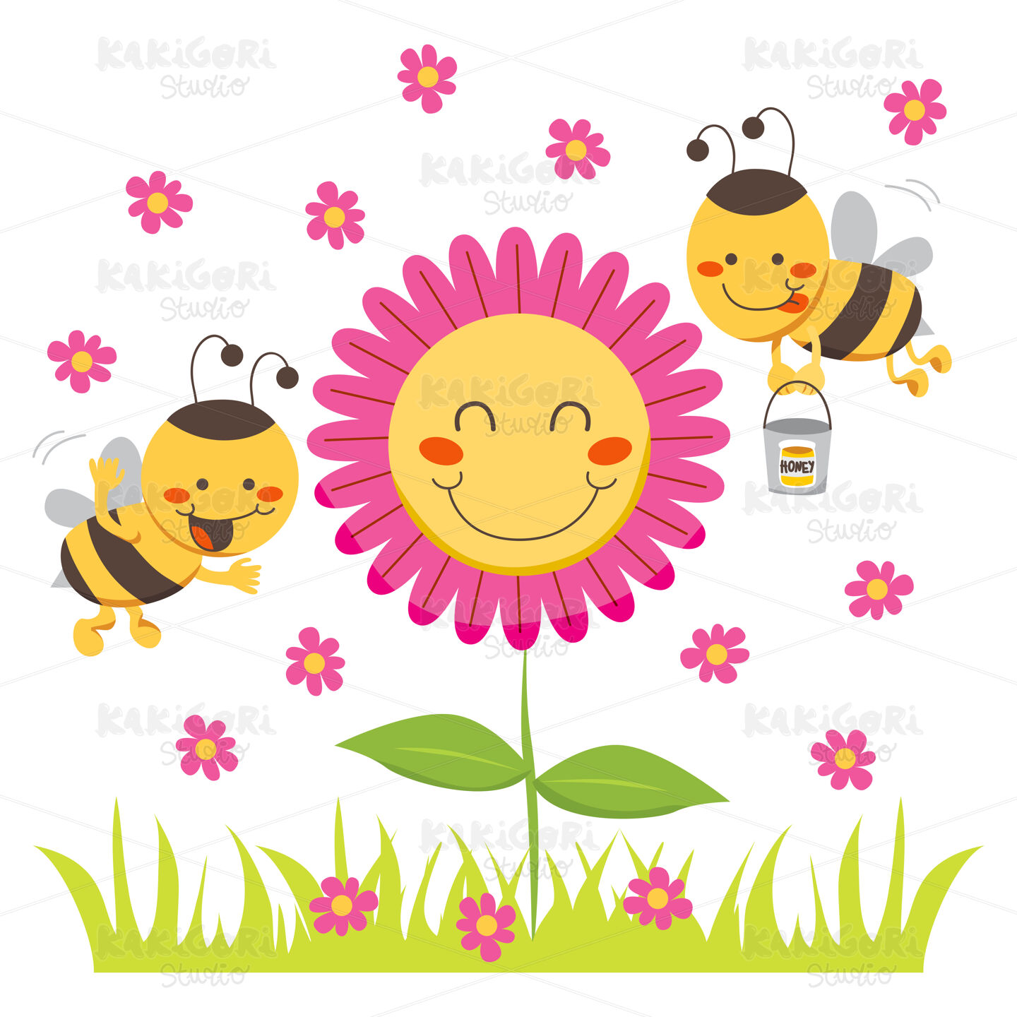 Two cute honey bees flying around a happy flower carrying a bucket