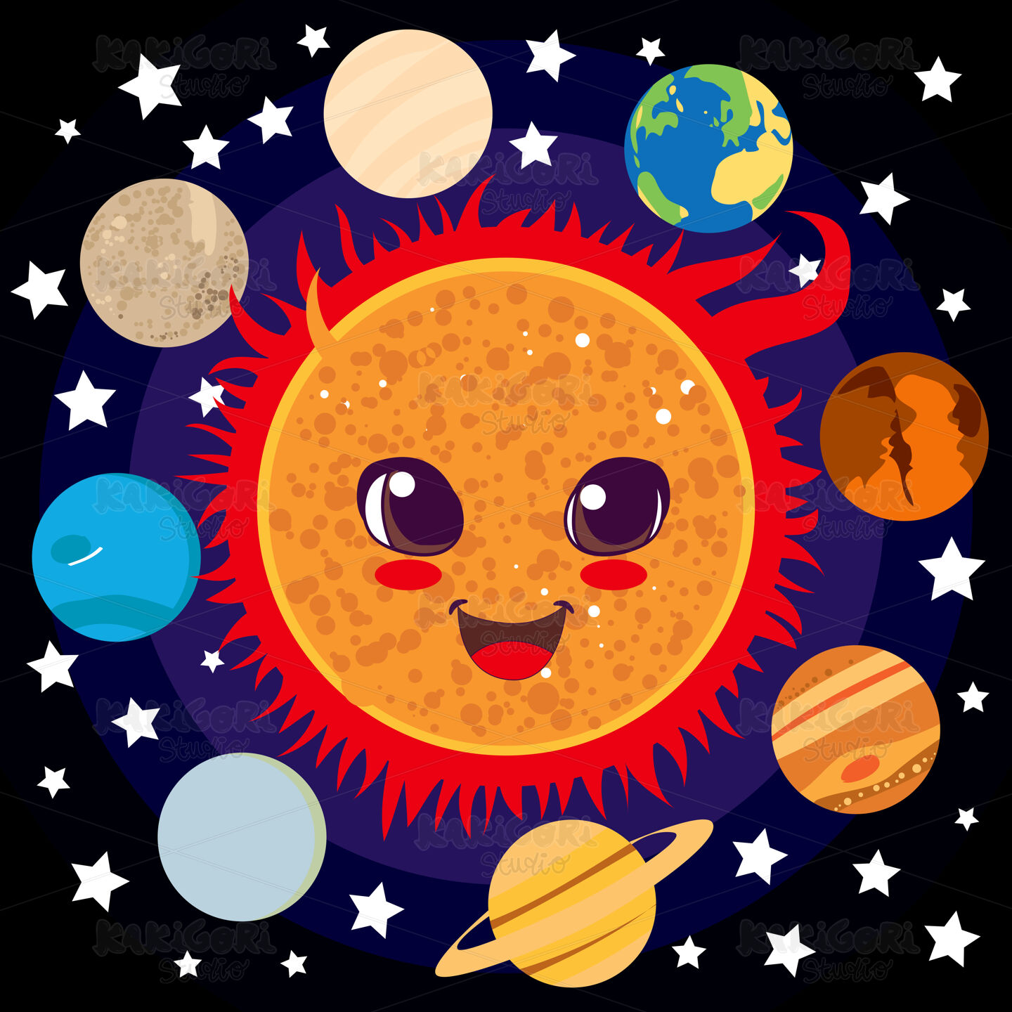 Cute happy Sun with planet friends circling him