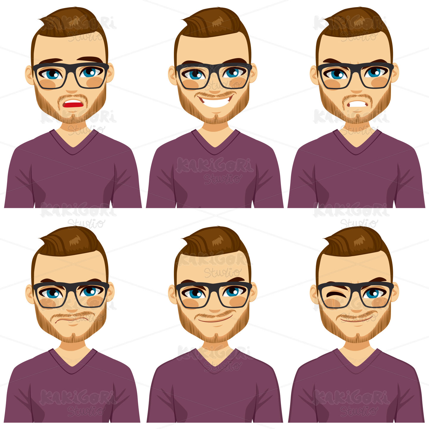 Attractive brown haired young hipster man with glasses on six different face expressions collection