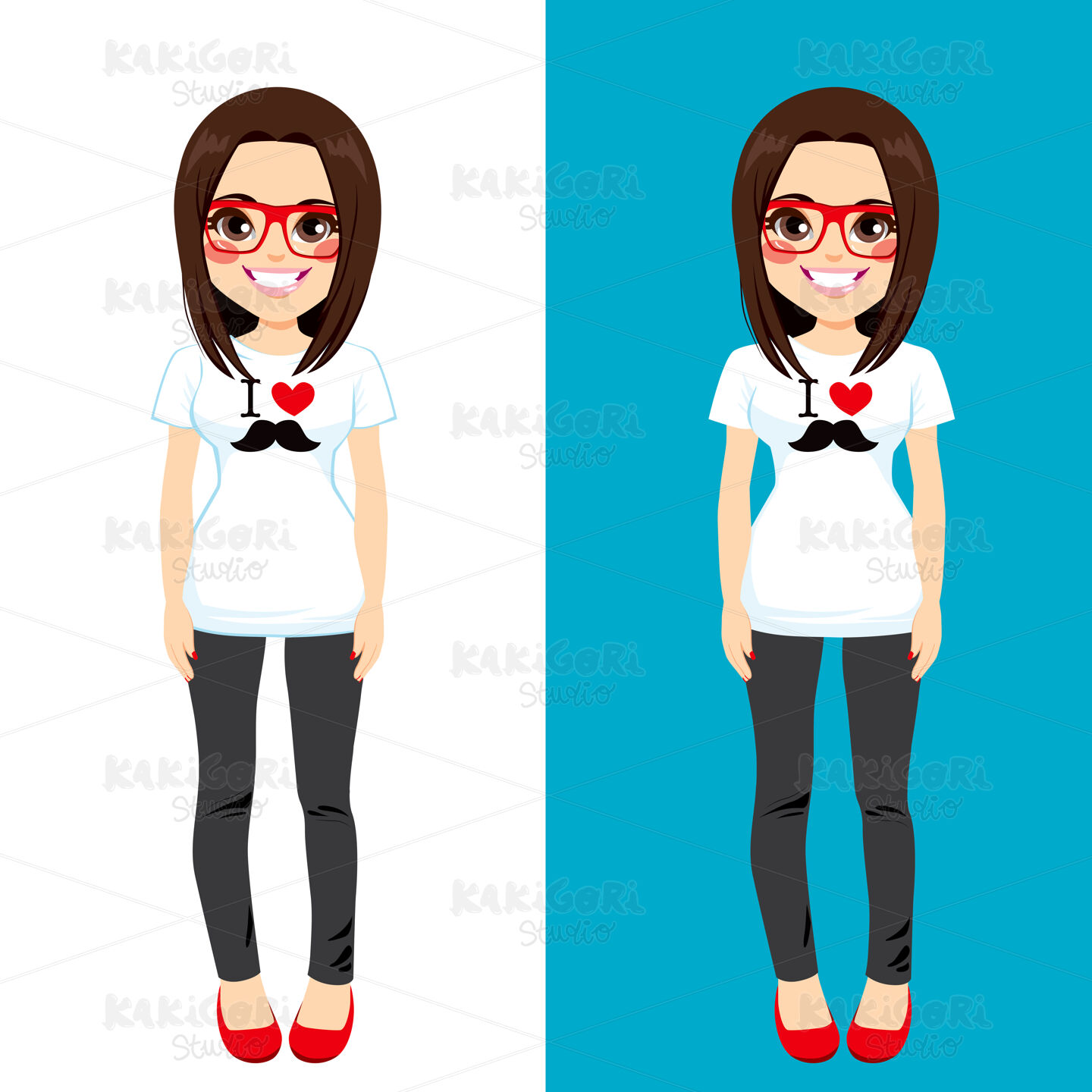 Cute brunette teenager girl wearing white shirt with I love mustache print design in two different background color versions