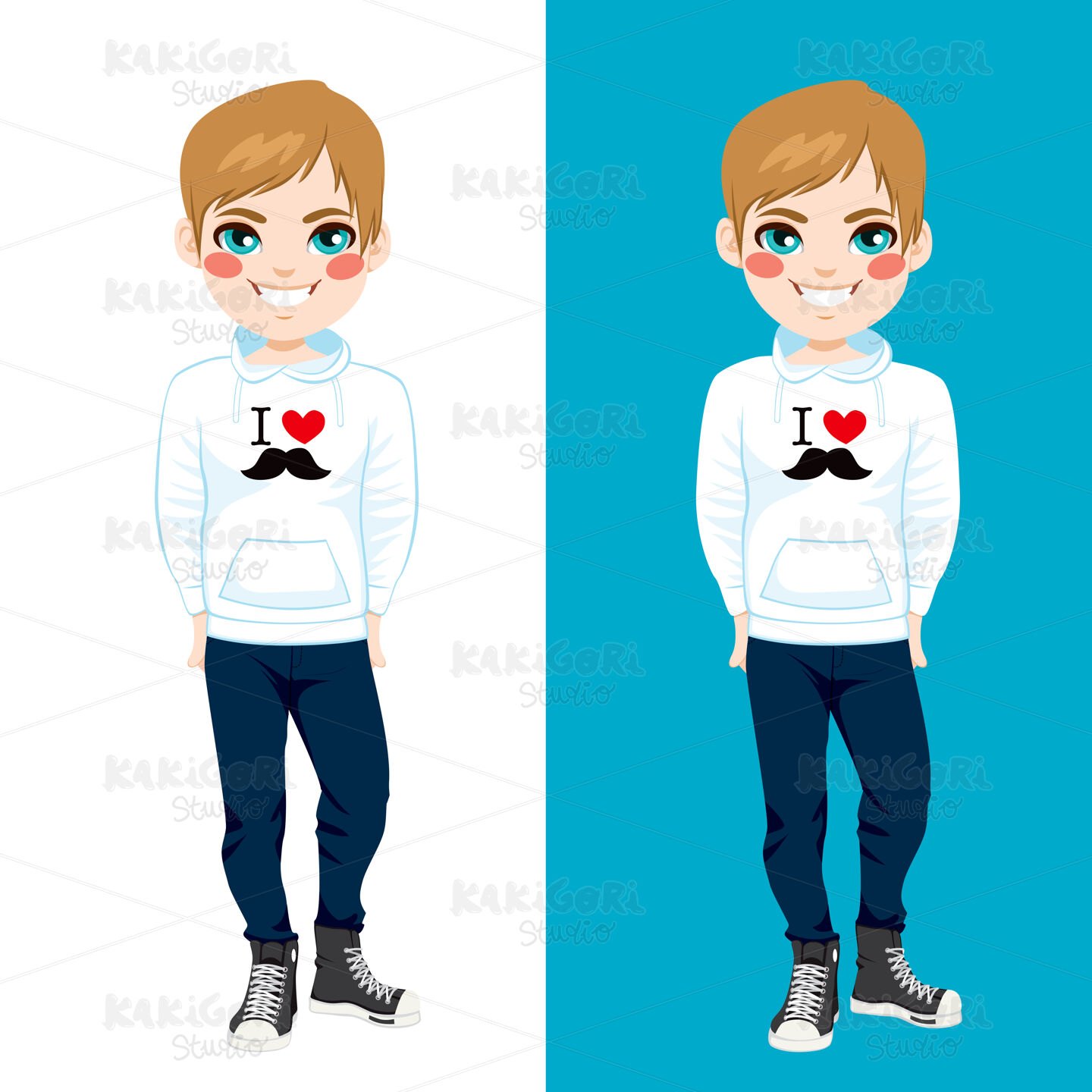 Teenager boy wearing white sweatshirt with I love mustache print design and jeans in two different background color versions