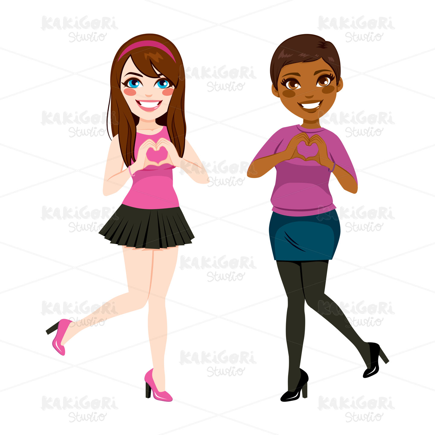 Full body beautiful Caucasian and African American women making heart symbol with hands