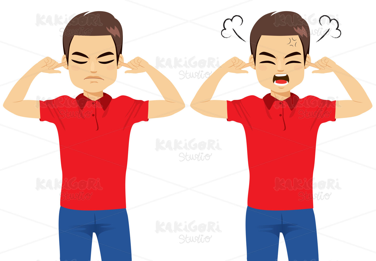 Young angry man in two face gesture actions covering ears with fingers