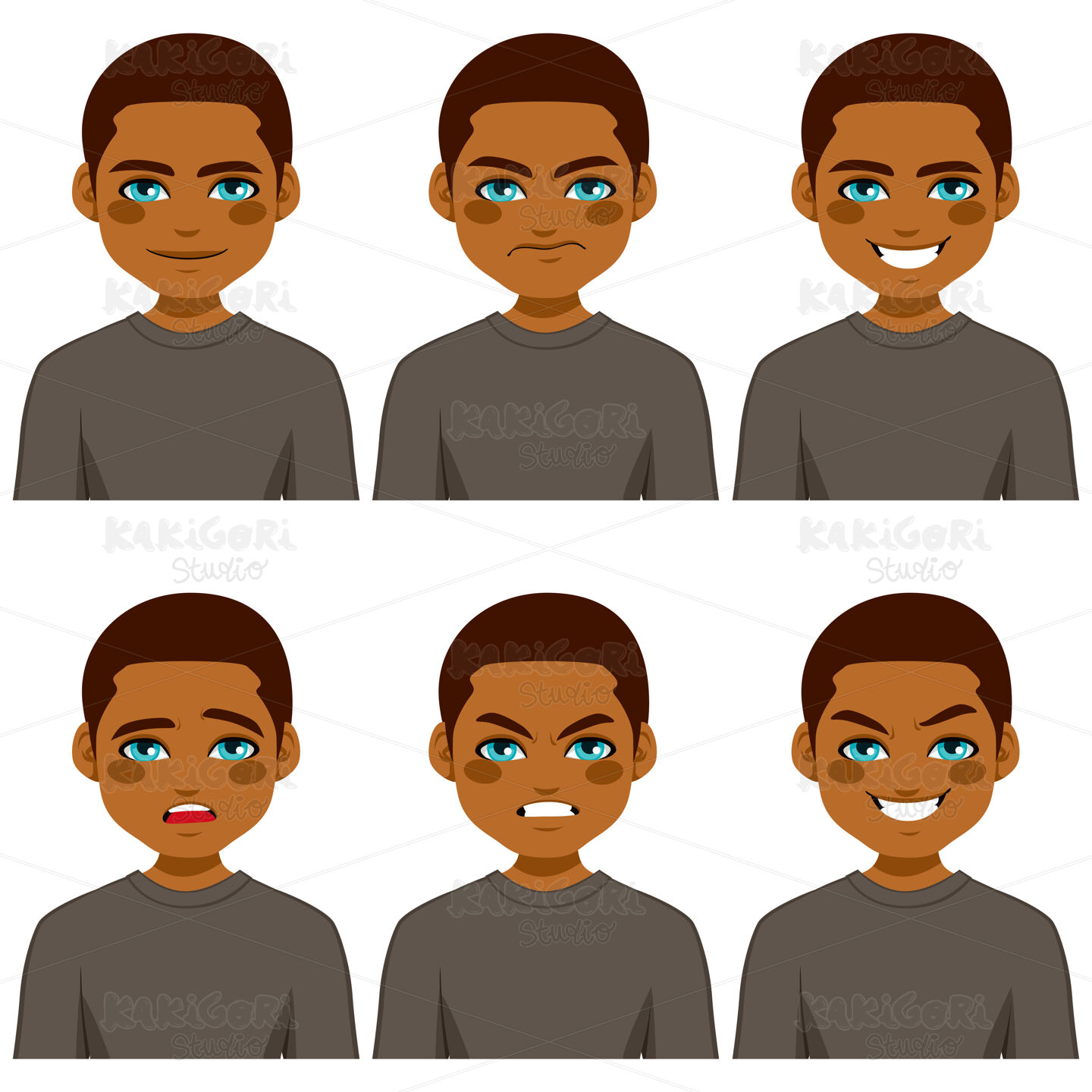 Young African American man making six different face expressions collection wearing grey shirt