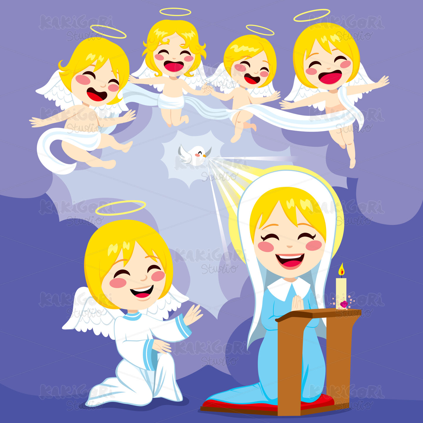 Annunciation scene of Mary receiving good news from Gabriel and angels about becoming mother of Jesus