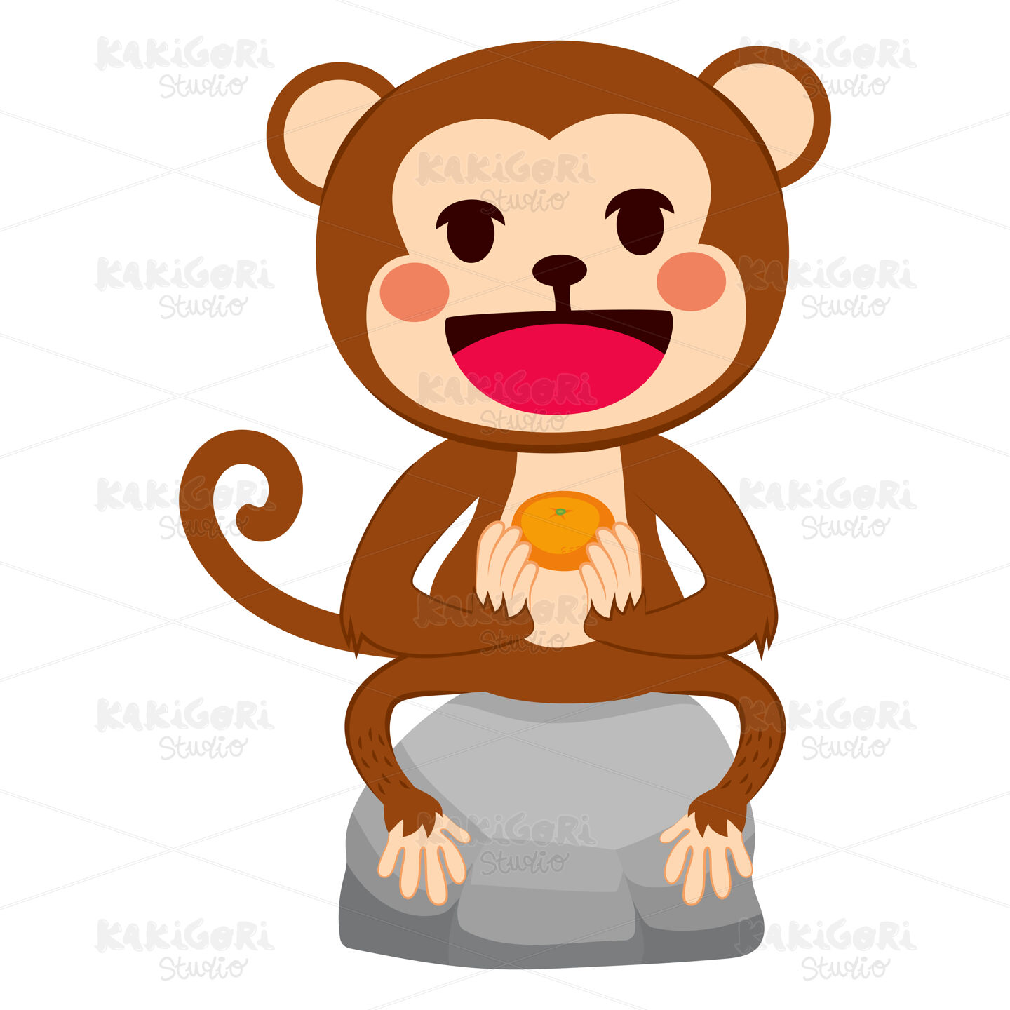 Illustration of funny monkey sitting on stone with mandarin orange tangerine fruit on his hands