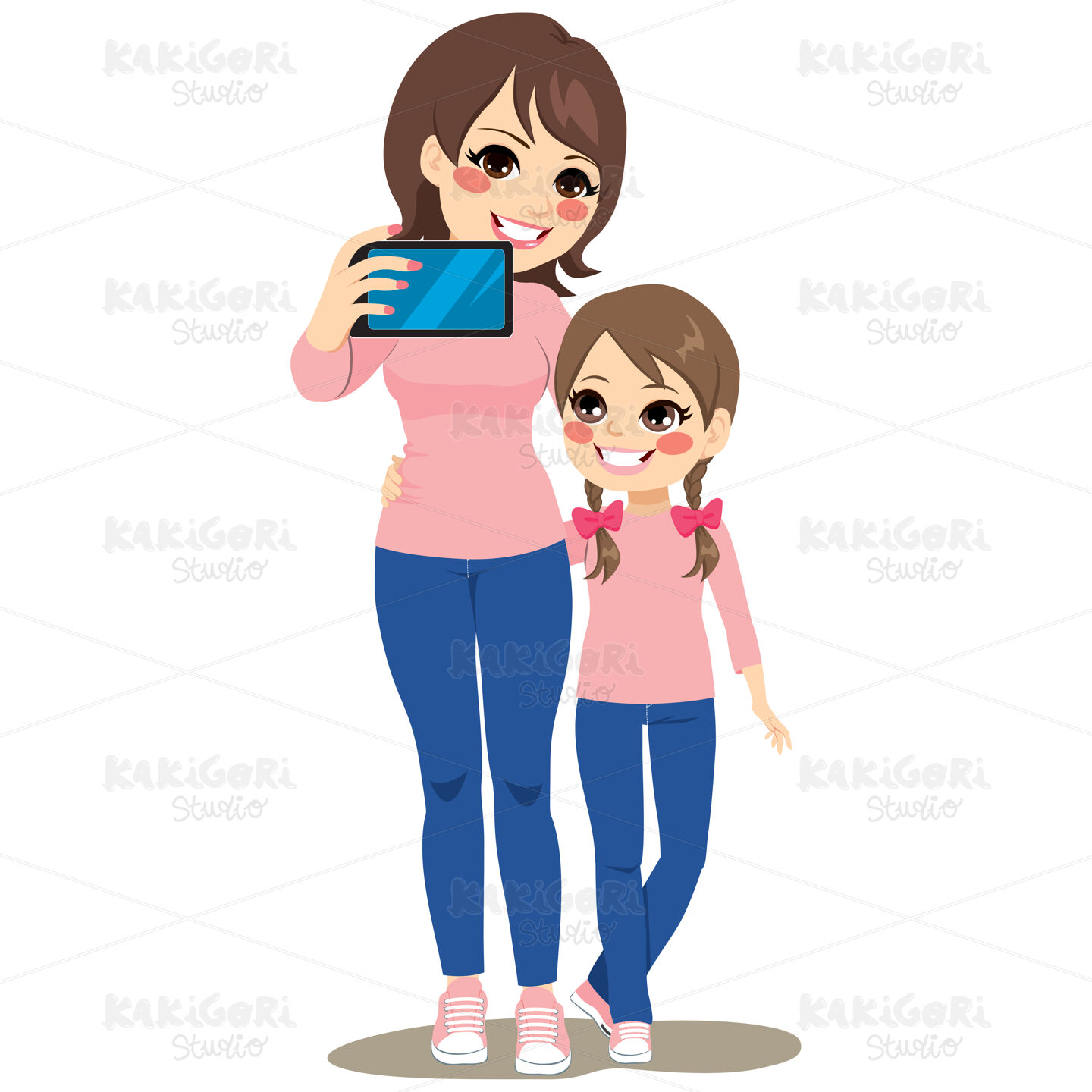 Beautiful mother and daughter happy making selfie together with same pink shirt and blue jeans outfit