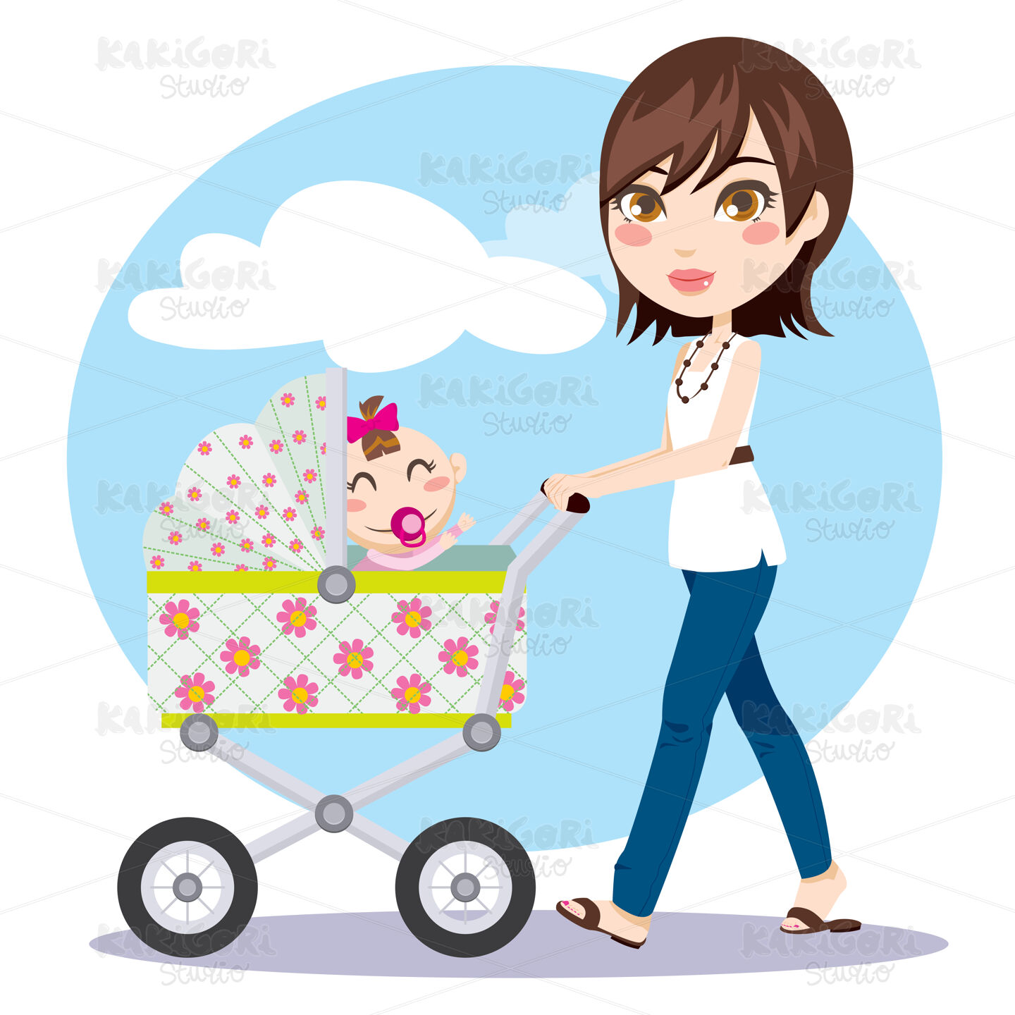 Cute young woman pushing baby carriage while her little girl tries to reach her