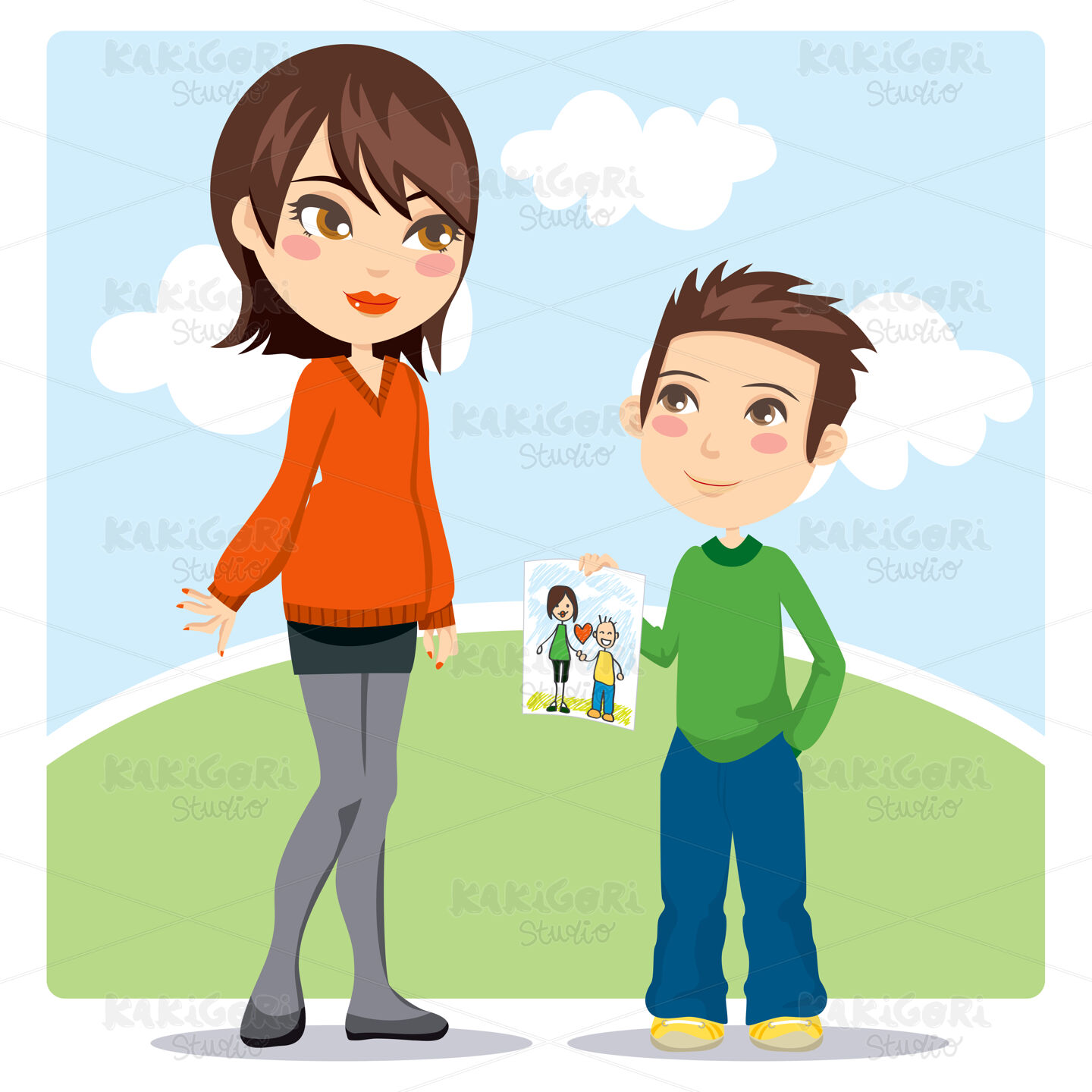 Young son giving a hand drawn illustration gift to her mommy on Mothers Day celebration