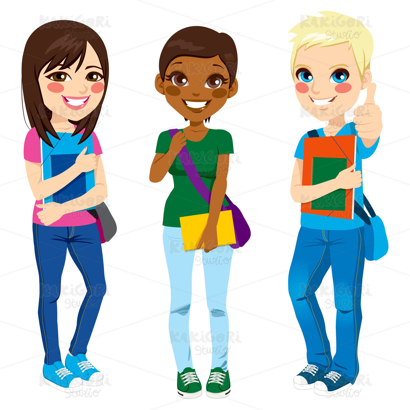 Multi ethnic group of three young teenage students standing with positive expression ready to go back to school with shoulder bag, folder and notebook
