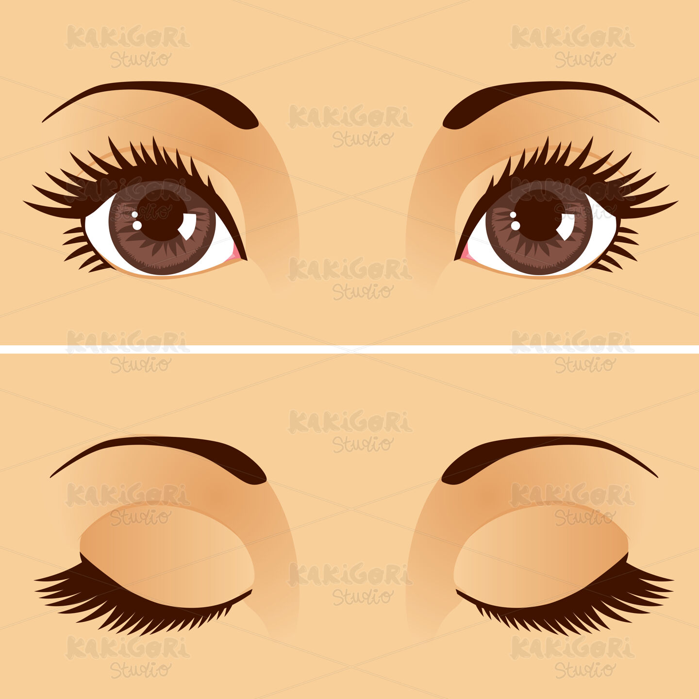 Closeup detail illustration of beautiful female brown eyes with eyelids open and closed