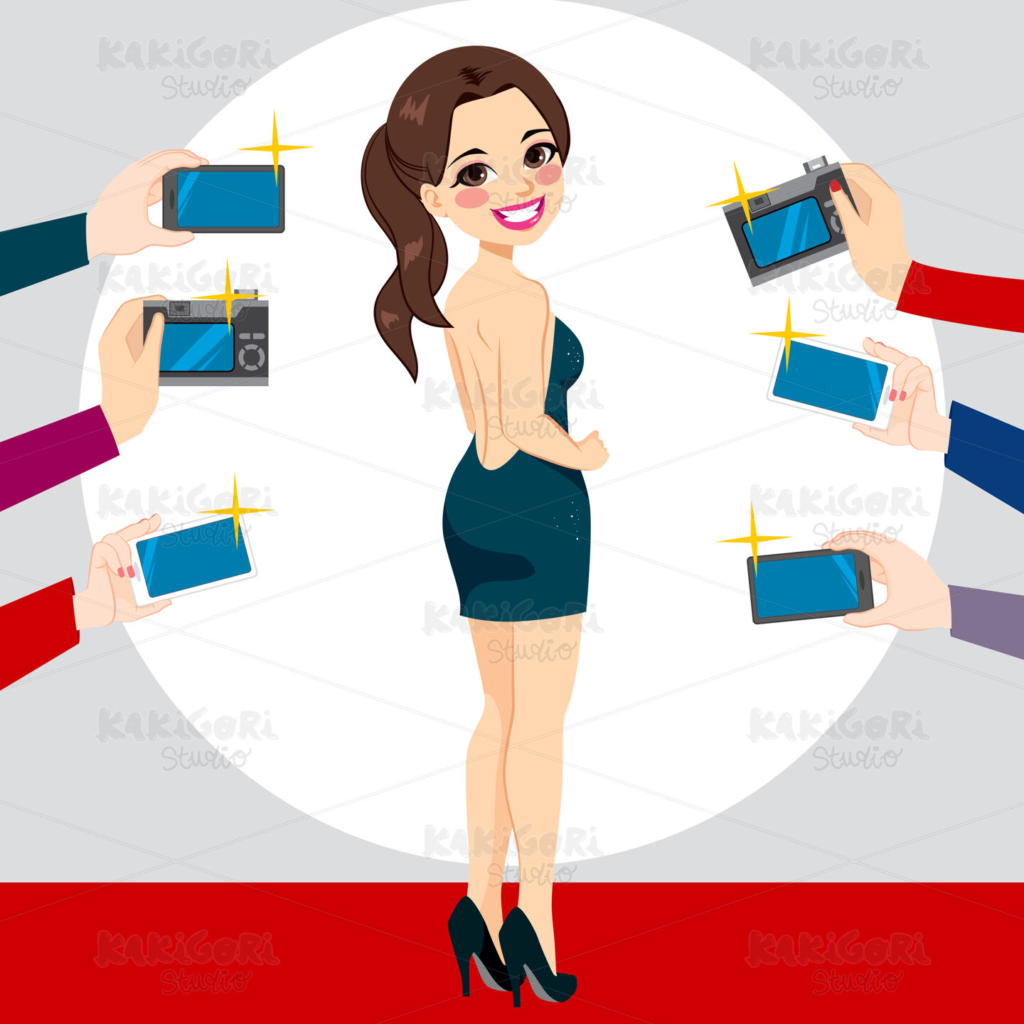 Beautiful young famous woman back view posing on red carpet for paparazzi photographing with cameras and smartphones
