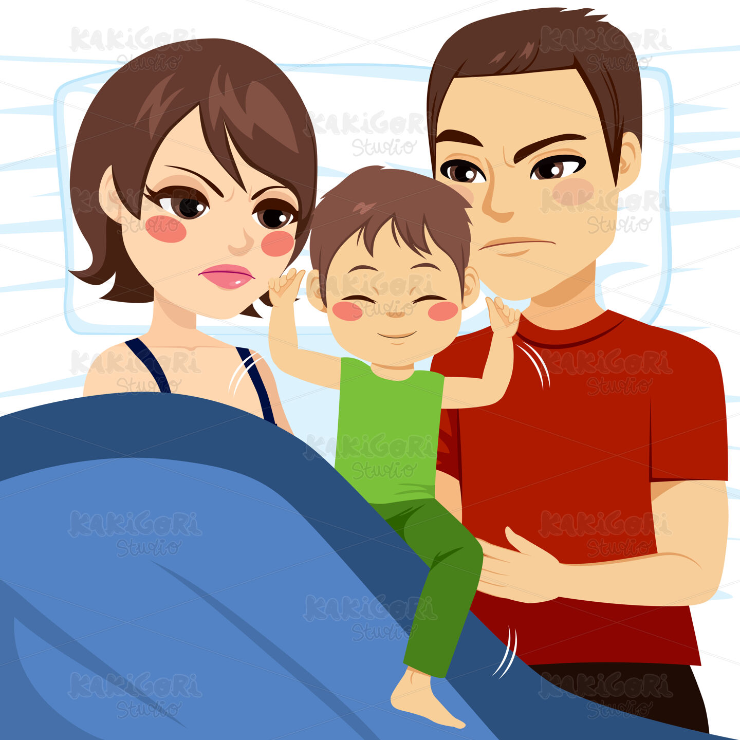 Illustration of upset parents unable to sleep because son is in bed moving and annoying