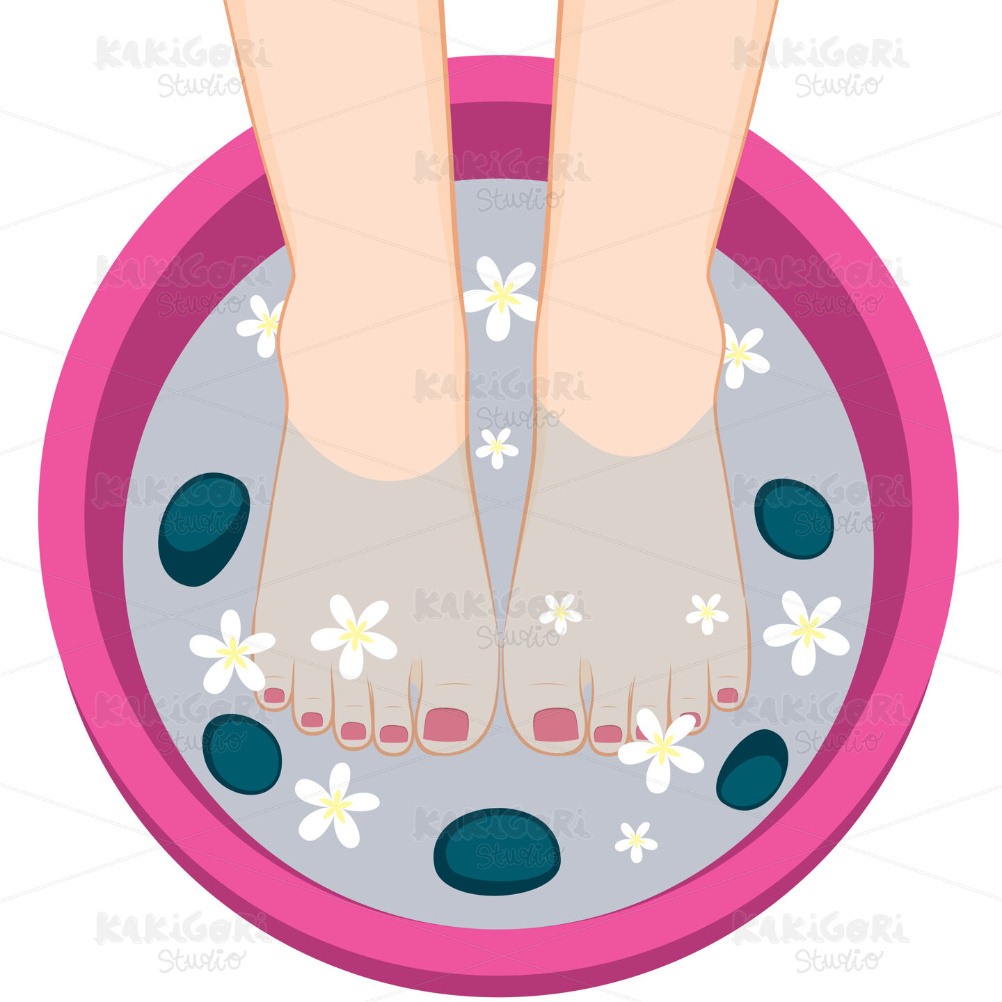 Illustration of female feet on spa bowl with stones and flowers having pedicure treatment