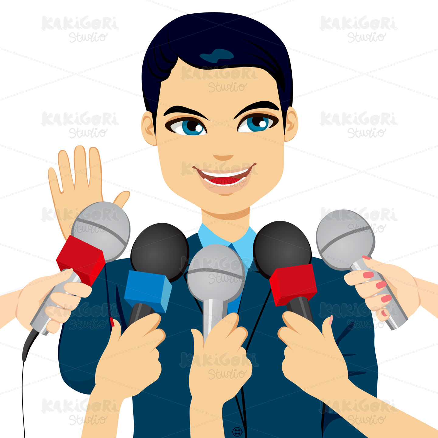 Male politician or businessman answering press questions in front of journalists holding microphones