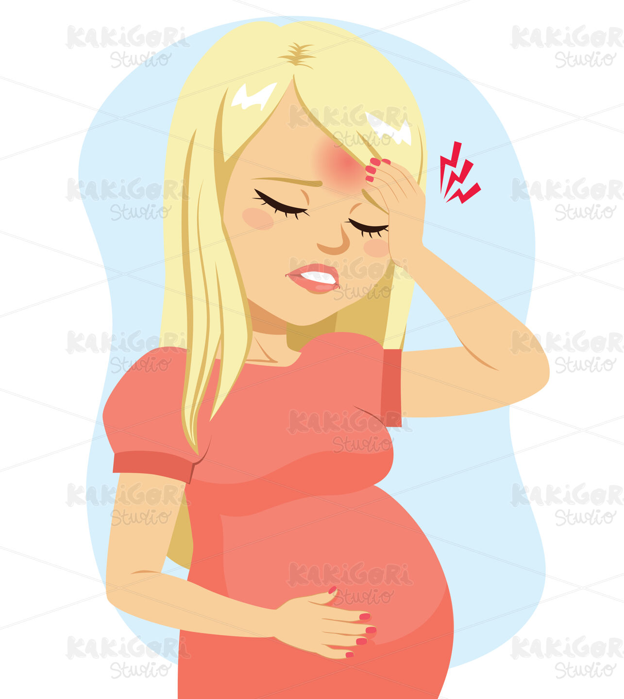 Young blonde pregnant woman suffering migraine pain holding head with hand while rubbing belly