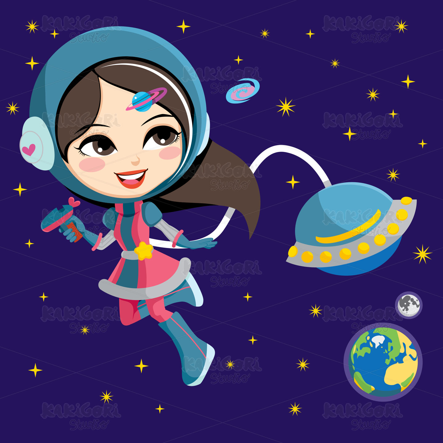 Pretty astronaut fashion girl exploring space from her flying ship orbiting the earth