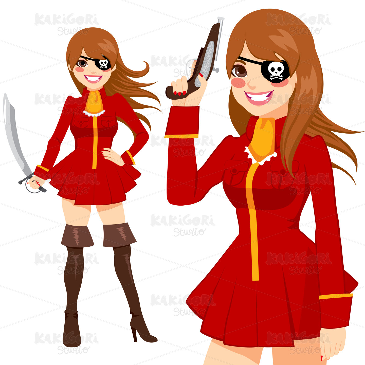 Beautiful brunette woman with red pirate suit costume happy smiling holding guns and sword ready for halloween party
