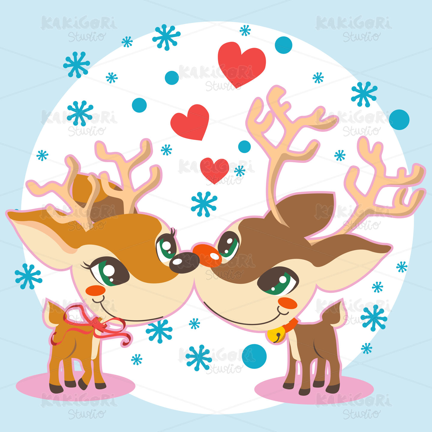Rudolph and female reindeer kissing in love on Christmas