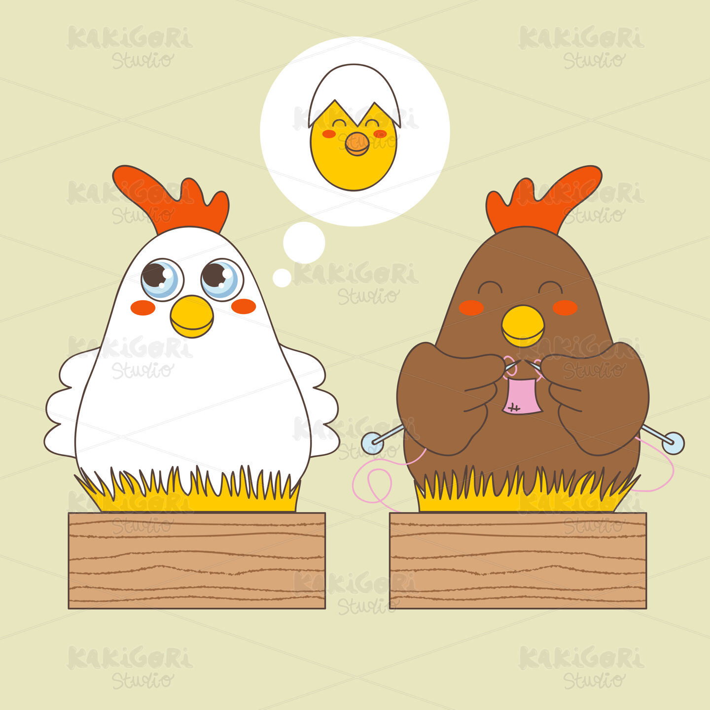 White and brown hens thinking about baby egg chick and knitting on straw wooden boxes