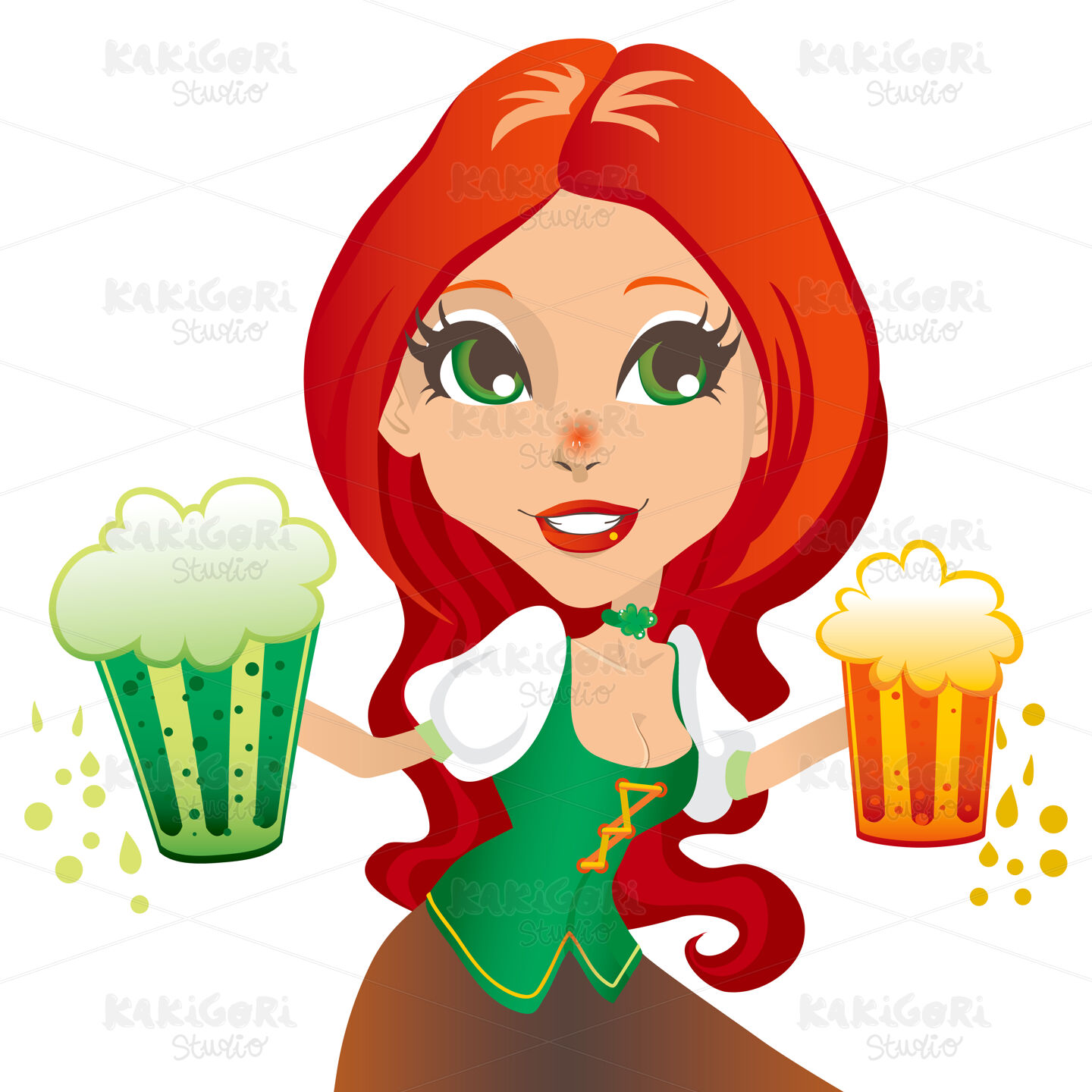 Saint Patrick day sexy red haired waitress smiling with two mugs of beer, one green and one gold