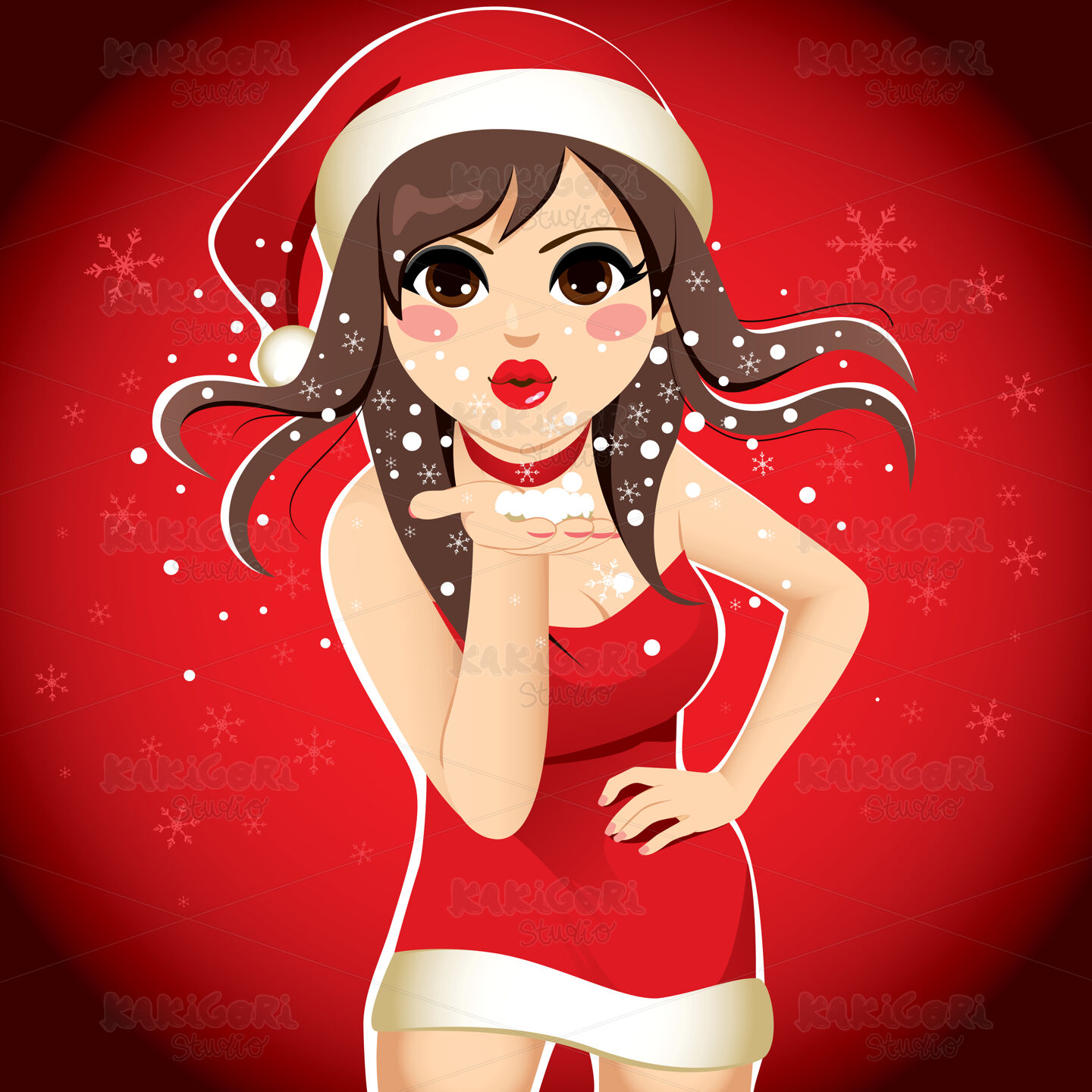 Beautiful Santa Claus woman in sexy red dress blowing snowflakes