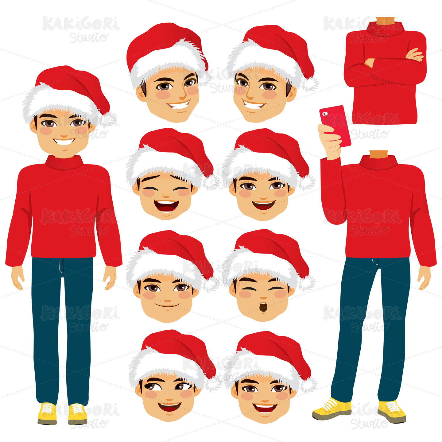 Young man with Santa hat costume paper doll male with a set of different face expressions, body pose and accessories
