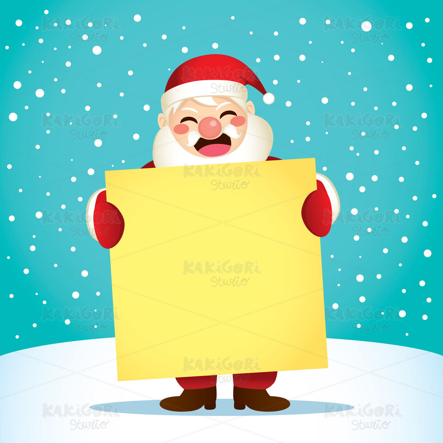 Santa Claus holding white blank placard poster with snow background