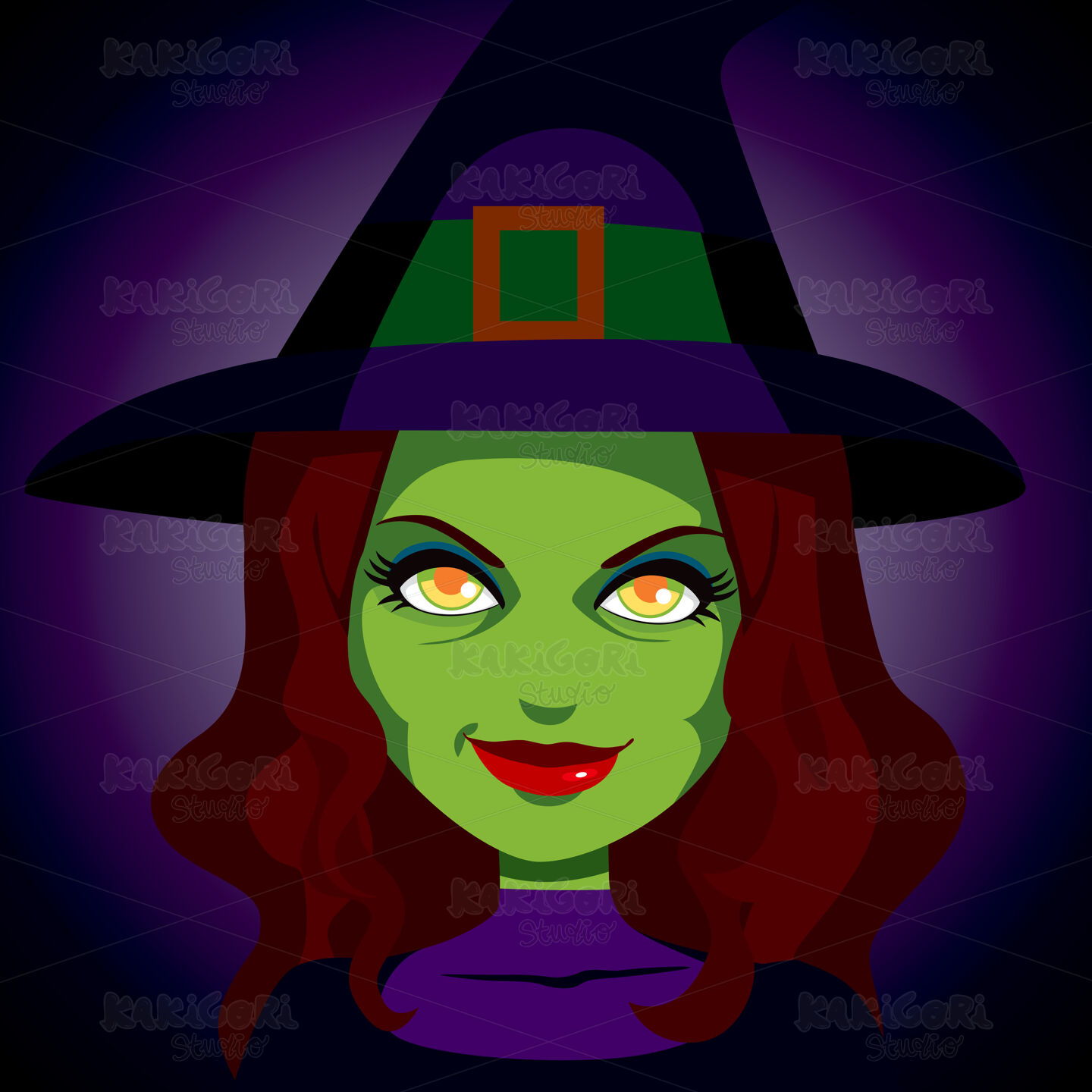 Illustration portrait of scary mysterious looking witch with face lit and magic glowing eyes on dark background