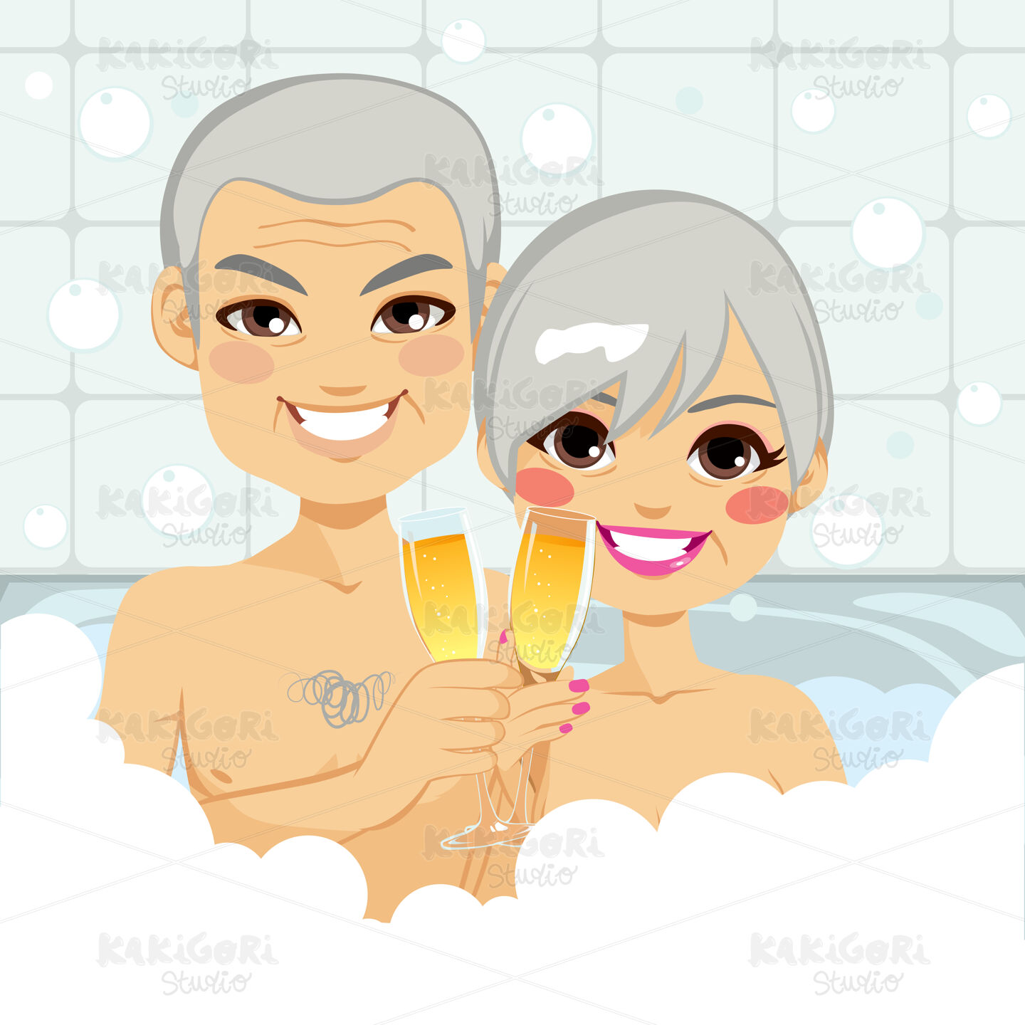Cute senior couple enjoying relaxing bubble bath together making a toast with champagne