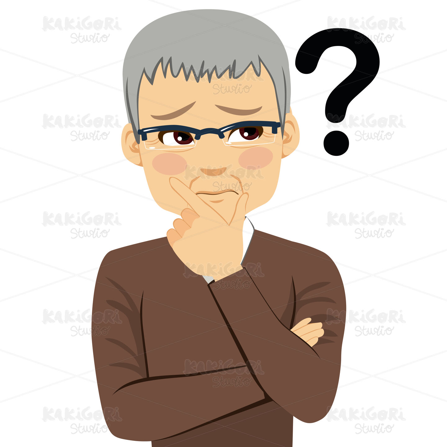 Senior man thinking suspiciously looking interrogation question mark with hand on chin