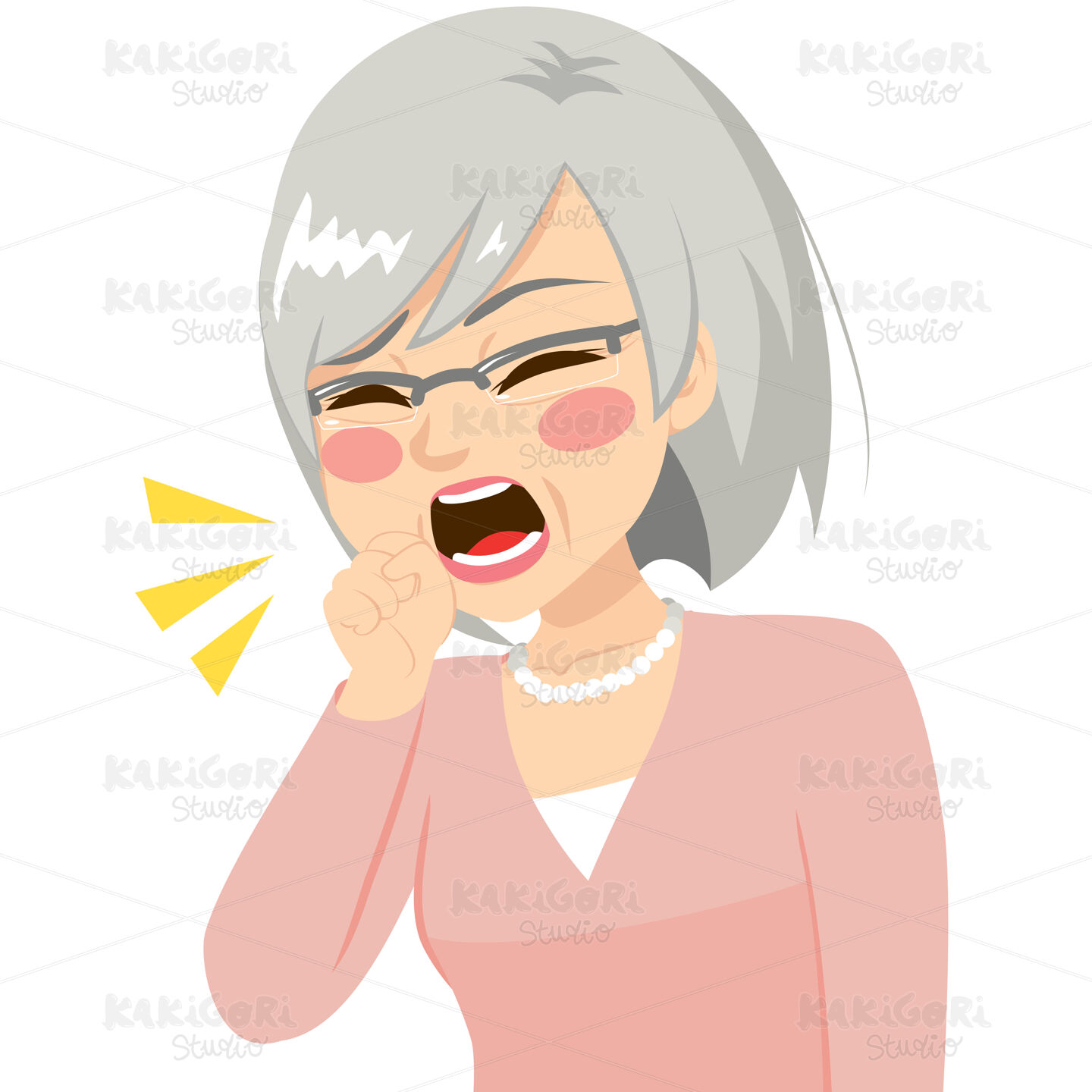 Illustration of senior woman coughing with fist in front of mouth