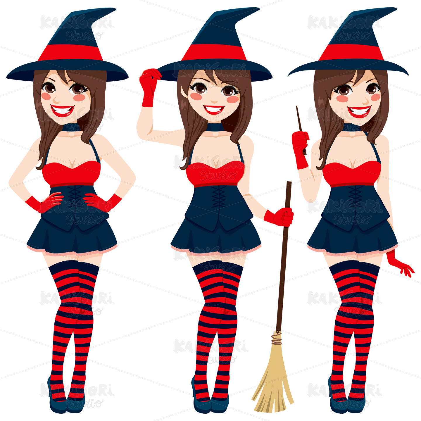 Beautiful sexy brunette witch woman making different poses holding magical wand and broom