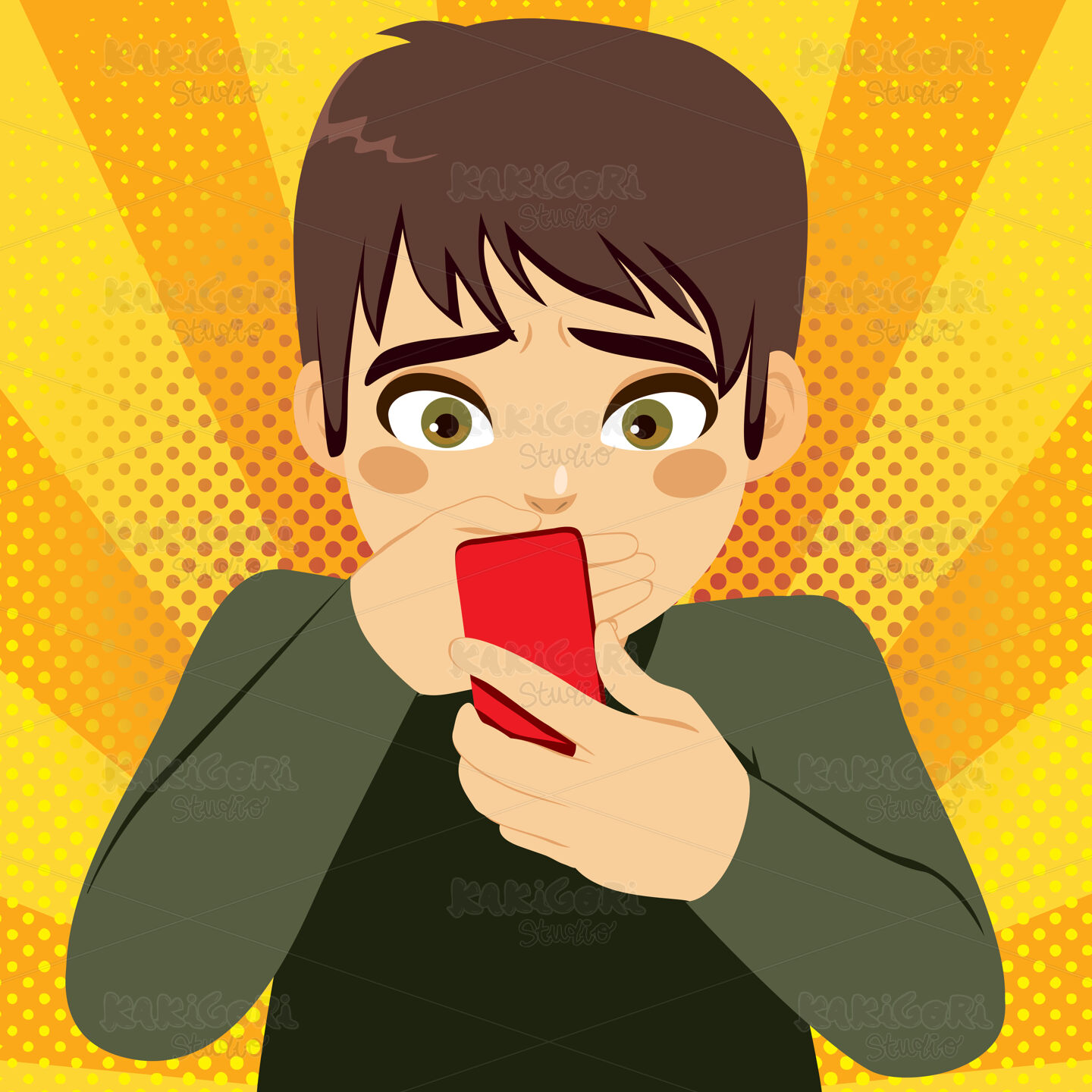 Teenager boy with hand on mouth looking shocked phone screen cyber bullying concept receiving message on mobile smartphone