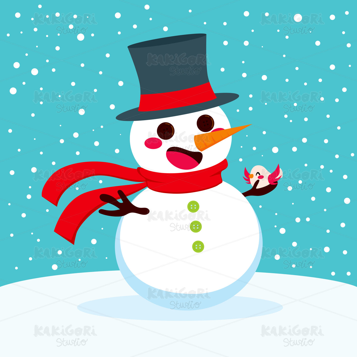 Cute snowman happy smiling with top hat and scarf holding little lovely bird on snow background