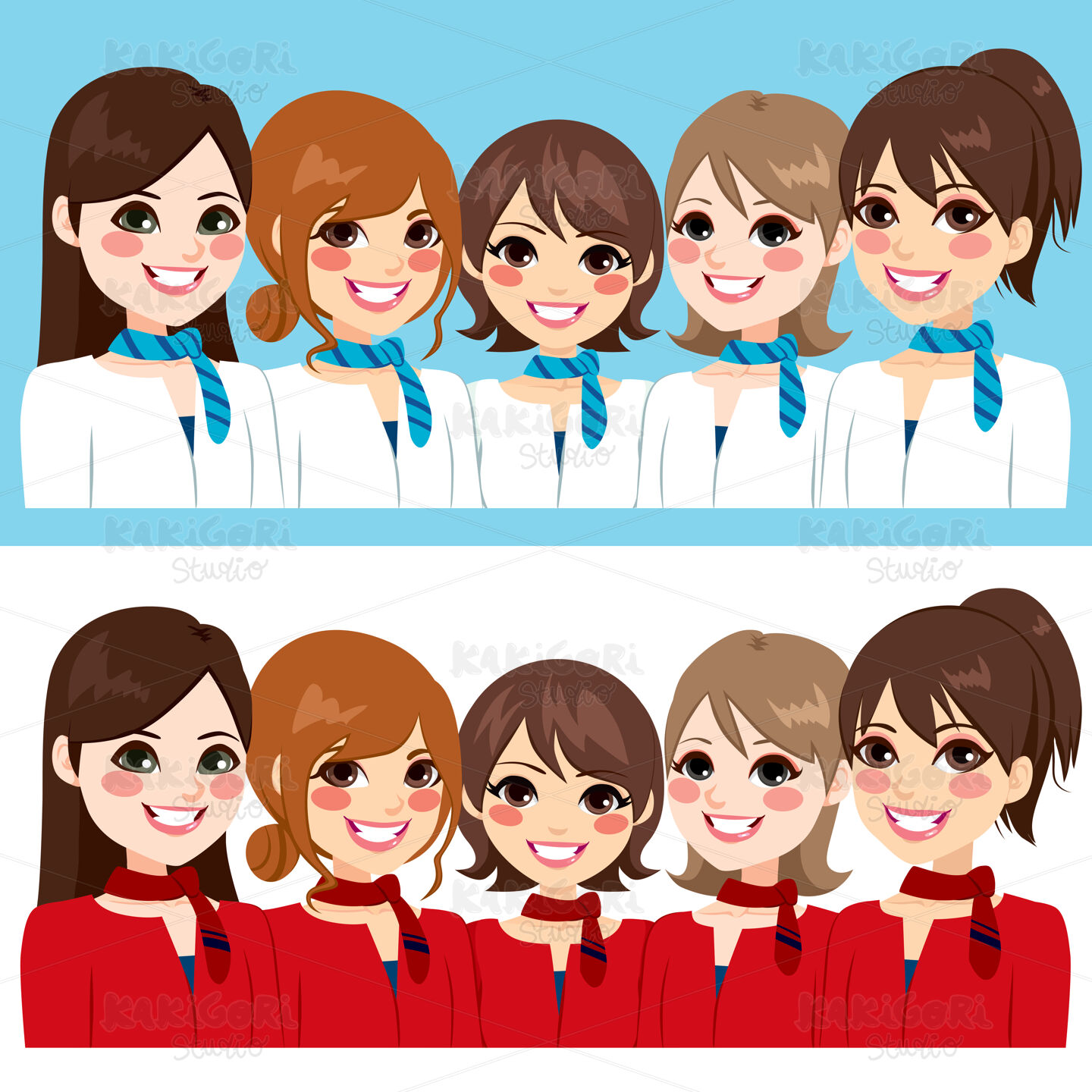 Beautiful stewardess women team posing together smiling on two different uniform color version
