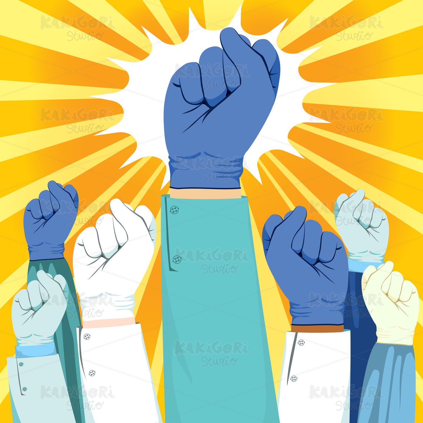 Super hero doctors and nurses fist up wearing different hand globes