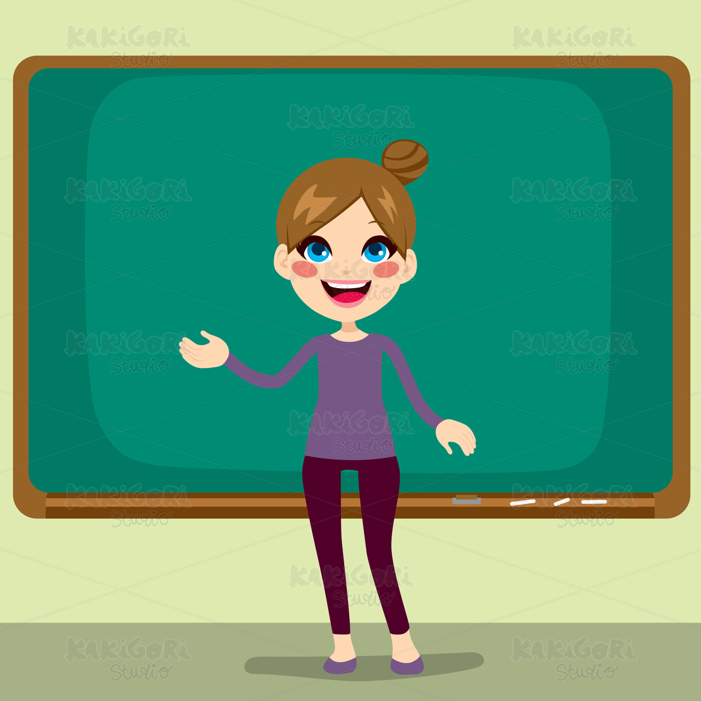 Beautiful happy young teacher woman standing teaching in front of empty blackboard in classroom