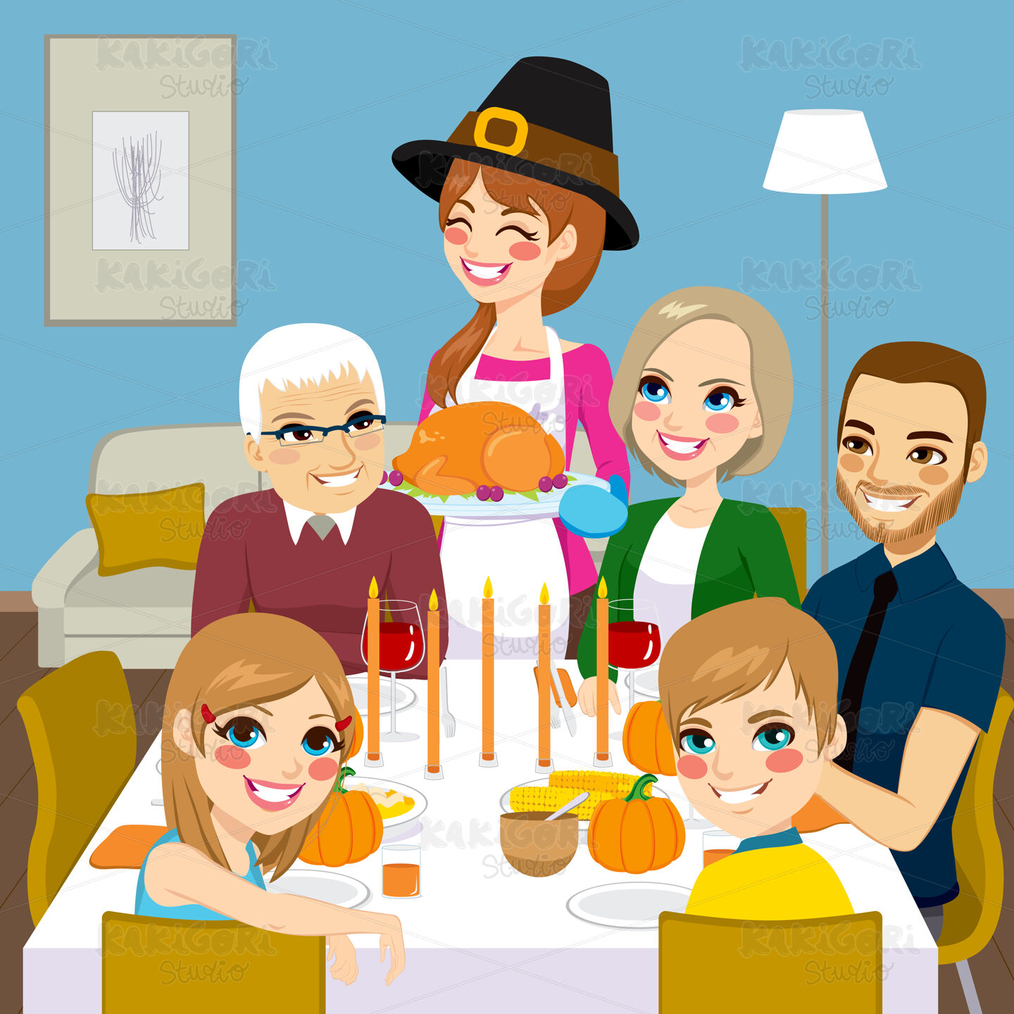 Happy family having thanksgiving dinner together with mom serving traditional roasted turkey