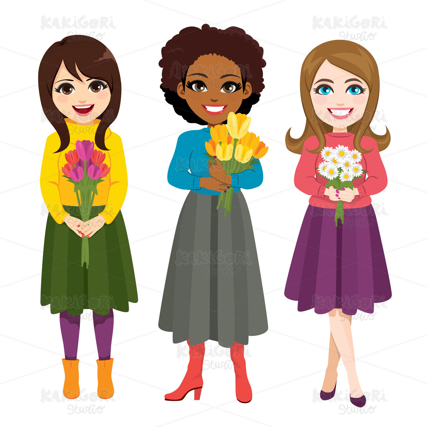 / Three Women Holding Flower Bouquet Clipart Vector Illustration 04934