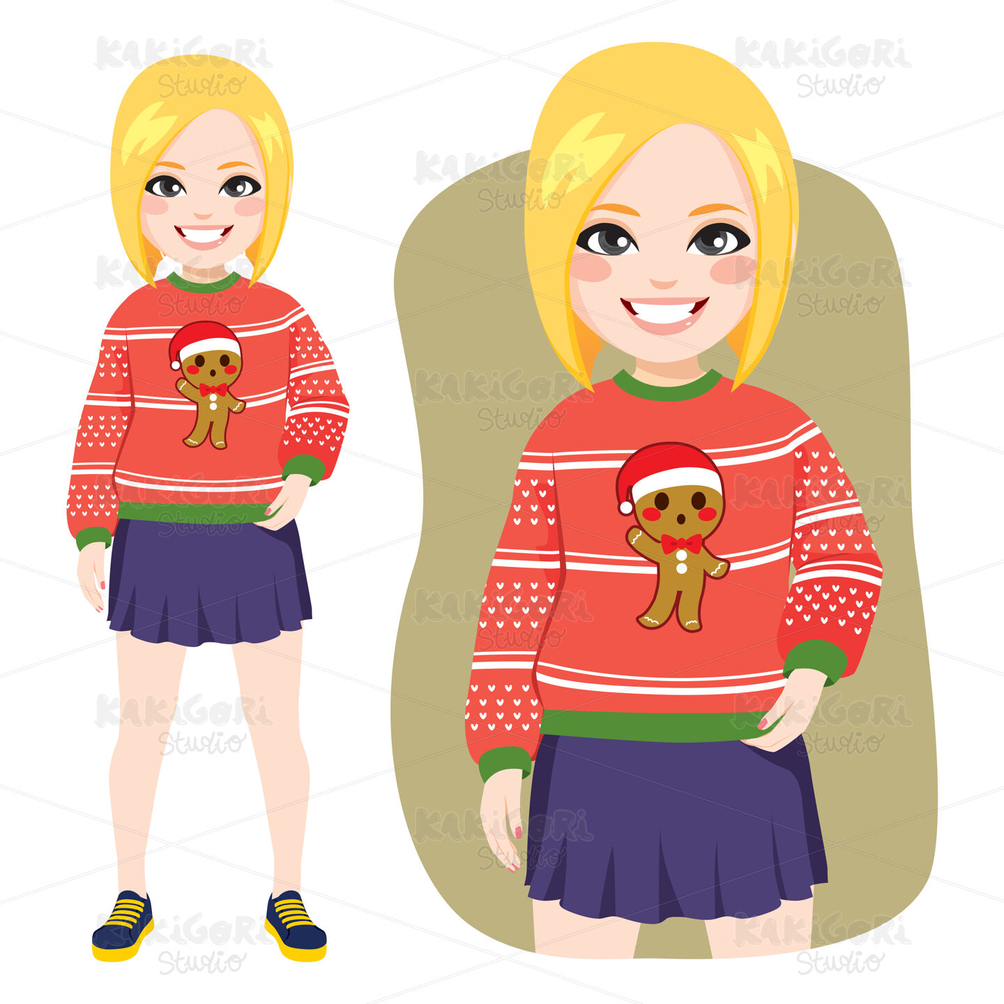 Beautiful young happy face expression blonde woman standing with ugly gingerbread Christmas sweater