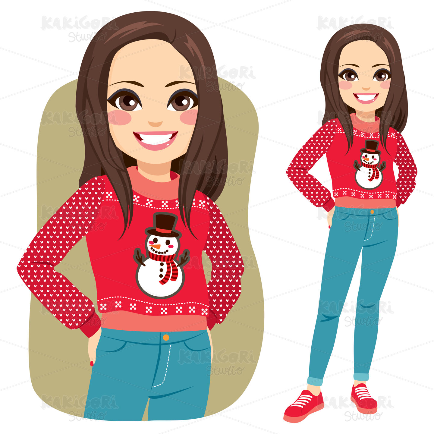 Beautiful brunette young woman with ugly Christmas sweater standing