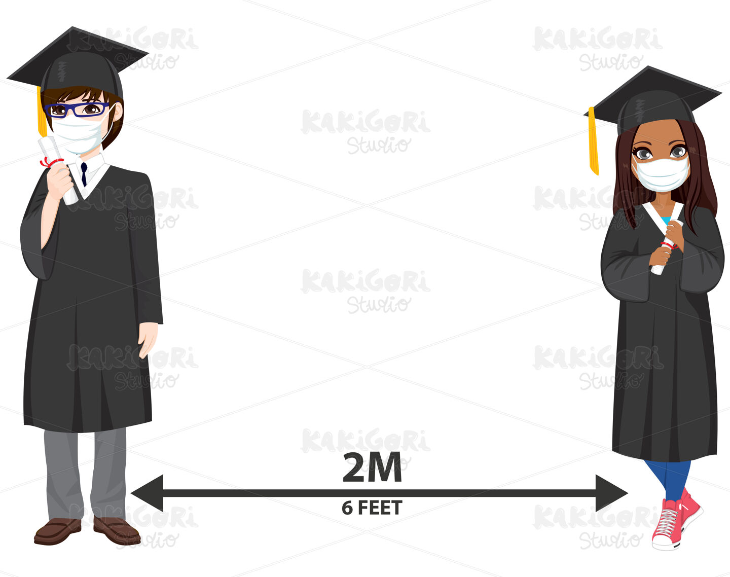Black female and white male university students with face masks covering nose and mouth holding diploma keeping social distance